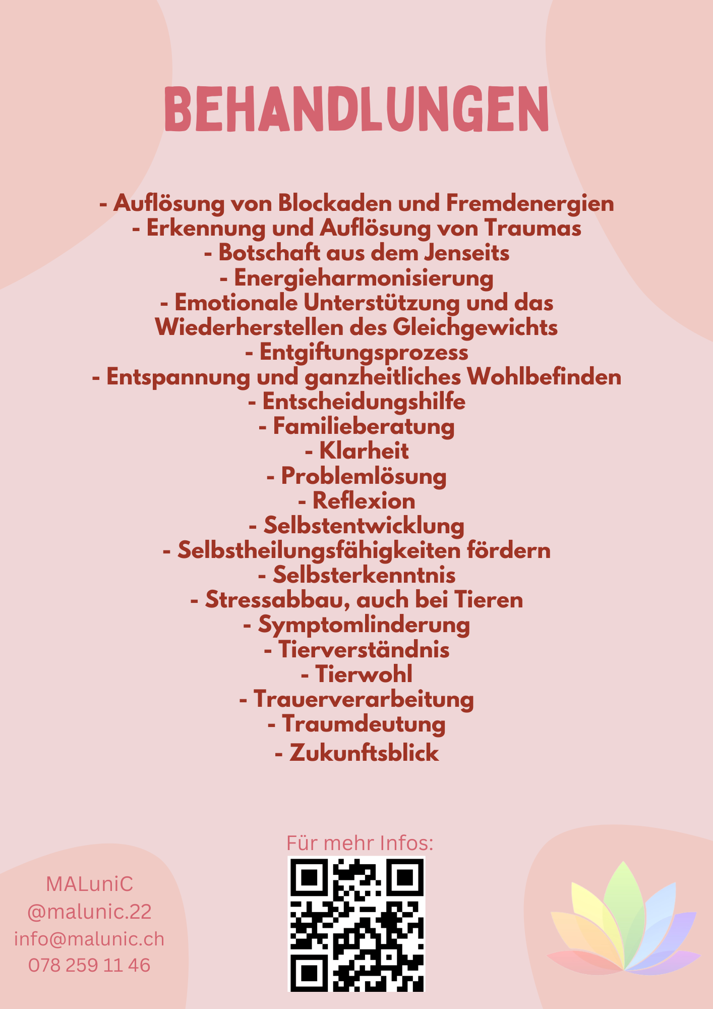 - Ich bin ausgebildete Reiki-Meisterin und Medium, ausgebildet durch Martina Eberle und Stefanie Messerli.